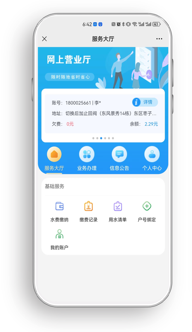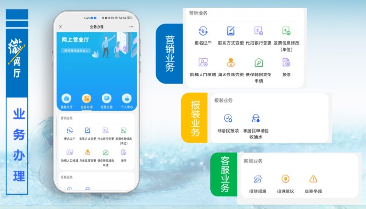 按照提示步驟,綁定用水開(kāi)戶(hù)賬號(hào)后,就能輕松便捷使用“微網(wǎng)廳”各項(xiàng)服務(wù)功能。用水開(kāi)戶(hù)賬號(hào)可查閱供水合同、服務(wù)短信或致電供水服務(wù)片區(qū)營(yíng)業(yè)服務(wù)熱線(xiàn)進(jìn)行查詢(xún)。